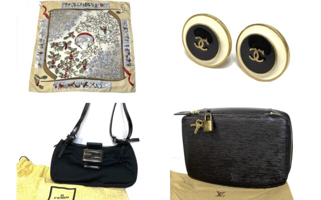 エルメススカーフ、シャネルイヤリング、フェンディバッグ、ヴィトンポーチ